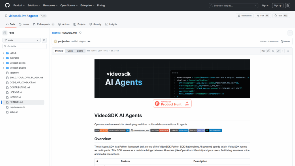 VideoSDK AI Agents is an open-source Python SDK built on top of the VideoSDK platform to create real-time, multimodal conversational AI agents that join VideoSDK meetings as participants. It is designed for developers who want to bridge LLMs and speech models with live audio/video sessions, enabling agents to listen, speak, and interact with human participants or phone systems. The repository provides core agent classes, session management, pipeline primitives for realtime and cascading model flows, and support for registering external and internal function tools. It documents prerequisites such as a VideoSDK auth token, a meeting ID, Python 3.12+, and third-party API keys for STT/LLM/TTS providers. The codebase includes examples and a plugin architecture so teams can assemble pipelines with different STT, LLM, and TTS providers and extend agent capabilities for production use.