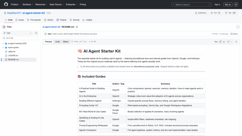 AI Agent Starter Kit is a curated collection of original, expert-authored documents intended to help engineers, product teams, and researchers learn how real AI agents are designed and deployed. The repository gathers foundational guides from OpenAI, Google, and Anthropic that teams have used to define agent components and practices. It emphasizes core agent concepts such as planners, executors, memory, iteration, role-based prompting, and retrieval-augmented approaches. The materials are organized for educational, non-commercial use and are presented as source PDFs under the /expert-guides directory. The target audience is builders constructing LLM-based agents from scratch, product teams planning rollouts, and researchers studying agent architectures. The README frames the collection as reference material to read, annotate, and apply to improve agent prototypes.