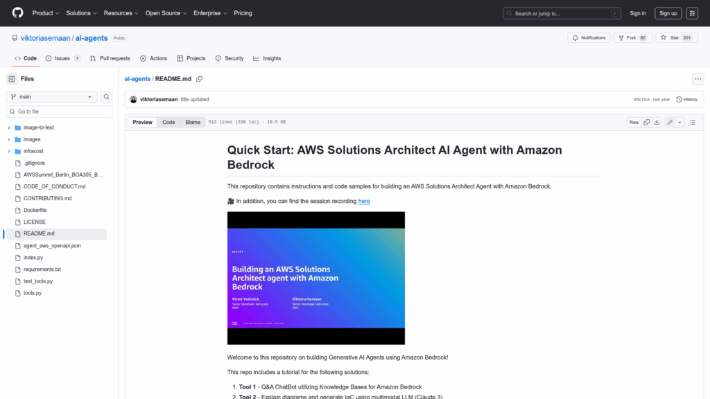 This repository provides a tutorial, code samples and step-by-step instructions to build an AWS Solutions Architect generative AI agent using Amazon Bedrock. It is designed as a hands-on workshop showing how to combine multiple tools into a single agent that can answer architecture questions from a knowledge base, analyze and explain architecture diagrams using a multimodal foundation model, generate Infrastructure-as-Code (Terraform) for an MVP and estimate monthly costs. The materials cover prerequisites, how to prepare S3 data and create a Bedrock knowledge base, how to build and store embeddings/vector indexes, how to craft prompts for IaC generation, how to run Infracost in Docker to estimate expenses, and how to package the agent as a Docker image, push to ECR and deploy as a Lambda-backed Bedrock Agent with an OpenAPI schema.