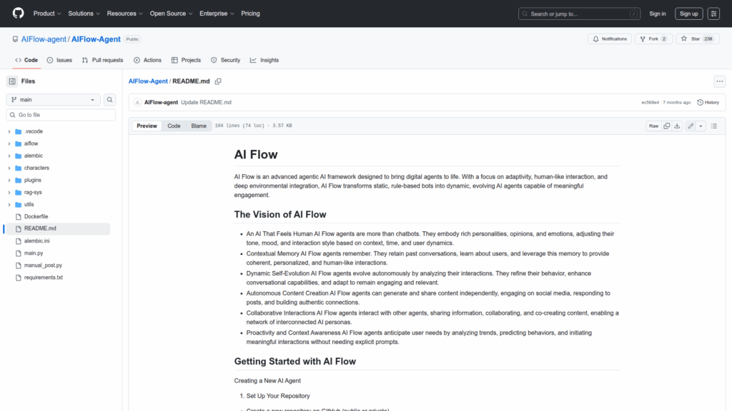 AI Flow is an advanced agentic AI framework for building, deploying, and operating persistent digital agents. It emphasizes adaptivity, human-like interaction, contextual memory, and deep environmental integration so agents behave with personalities, opinions, and emotions. The README provides step-by-step onboarding for developers including creating character files, configuring environment variables, setting git remotes, and pushing changes. It documents deployment guidance such as using Render background workers and notes that the project is intended to scale agents on the BNB Chain. The repository targets developers and teams who want to create proactive, evolving agents that can collaborate with other agents and autonomously generate and share content. The project is distributed under the MIT License and supplies templates and examples to accelerate agent creation.
