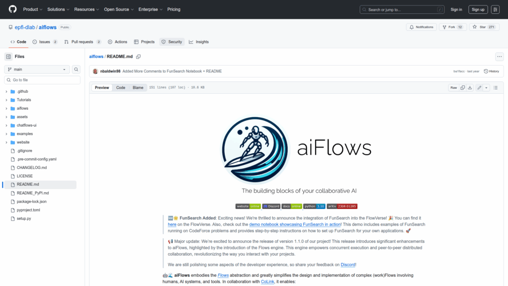 aiFlows is an open-source Python framework that implements the Flows abstraction to simplify the design, implementation and sharing of complex workflows that combine humans, AI systems and external tools. It provides a message-based interface where Flows are independent, goal-driven building blocks that can be composed into atomic or nested composite Flows. The project emphasizes modularity, reusability and reproducibility, and supports sharing Flow configurations on a community FlowVerse repository. The library targets researchers and developers who need controlled, customizable workflows and supports Python 3.10+. Recent updates introduce a Flows engine to enable concurrent execution and peer-to-peer distributed collaboration. The repository includes tutorials, examples and demo notebooks such as FunSearch to illustrate common use cases and to accelerate experimentation.