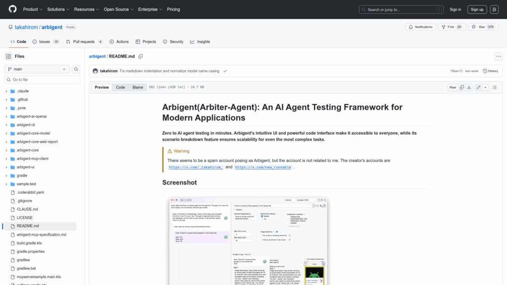 Arbigent is an open source AI agent testing framework designed to make end-to-end testing of modern applications practical by using AI agents to interact with real or emulated devices. It breaks complex goals into dependent scenarios that can be authored via a graphical UI or saved as YAML and executed programmatically or from a CLI. The project targets mobile, web and TV form factors and provides interfaces for plugging different AI providers and device drivers. It also supports integration with existing deterministic test flows by running Maestro YAML as initialization steps and can be extended with external tools via a Model Context Protocol (MCP) server configuration. The repository includes a UI binary, a Homebrew-installable CLI, example YAML project files, and Kotlin-based code examples that demonstrate loading a project file, creating agent configurations and running scenarios against connected devices.