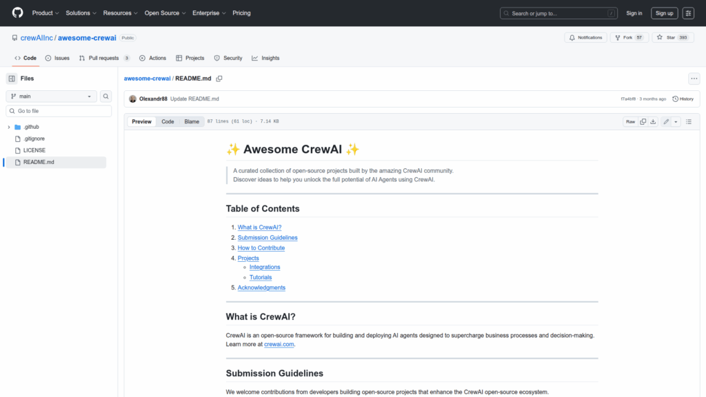 This repository is a curated collection of open-source projects and resources built around the CrewAI framework. It collects example integrations, tutorials, apps and community contributions that demonstrate how to build and deploy AI agents using CrewAI. The README explains what CrewAI is, sets submission and eligibility guidelines for inclusion, and describes how contributors can add projects. The list emphasizes open-source, developer-oriented projects maintained by individuals or small teams and excludes commercial or company-led proprietary offerings. The repository is intended as a discovery hub for developers, educators and practitioners looking for practical examples, patterns and community-built tools that extend or showcase CrewAI capabilities.