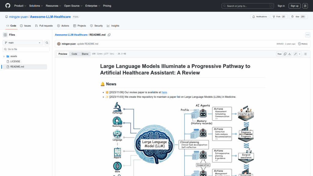 This repository is a curated anthology and living bibliography of research, code, and resources about large language models (LLMs) in medicine. It collects and organizes recent work on general-purpose and specialized medical LLMs, multimodal vision-language models, LLM-powered healthcare agents, and evaluation strategies. The README provides categorized sections that summarize papers and point to available implementations and demos when present. The project accompanies a review paper by the maintainers and is intended to track technical progress, integration challenges, and methodological advances rather than provide clinical deployment advice. It is structured to help readers navigate literature, surveys, datasets, benchmarks, and related repositories. The maintainers invite community contributions, issues, and pull requests and provide citation and license information for academic use.