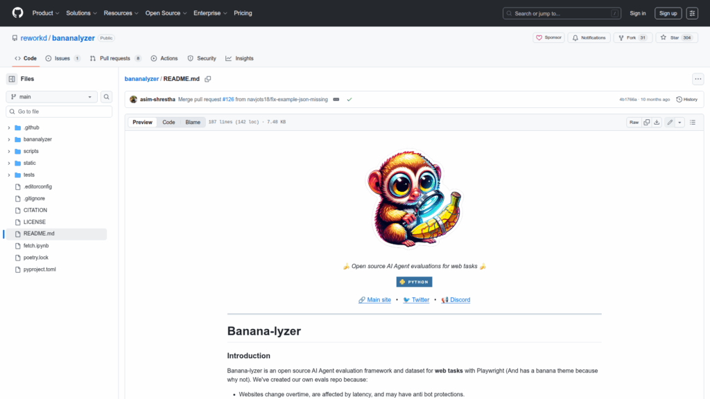 Bananalyzer is an open source evaluation framework and dataset for testing AI agents on web tasks using Playwright. It provides a CLI that runs structured evaluation examples defined in a examples.json file and serves historic static snapshots of pages as MHTML so tests remain reproducible despite site changes, latency, or anti-bot protections. Users plug in their agent by implementing an AgentRunner interface and exposing an agent instance, and the tool dynamically constructs pytest test suites to execute examples. The repo includes utilities and a notebook to capture pages, a basic FastAPI server to expose example data and API docs, a schema inspired by existing web datasets, and a roadmap to add multi-step interactions and translate other web evaluation datasets.