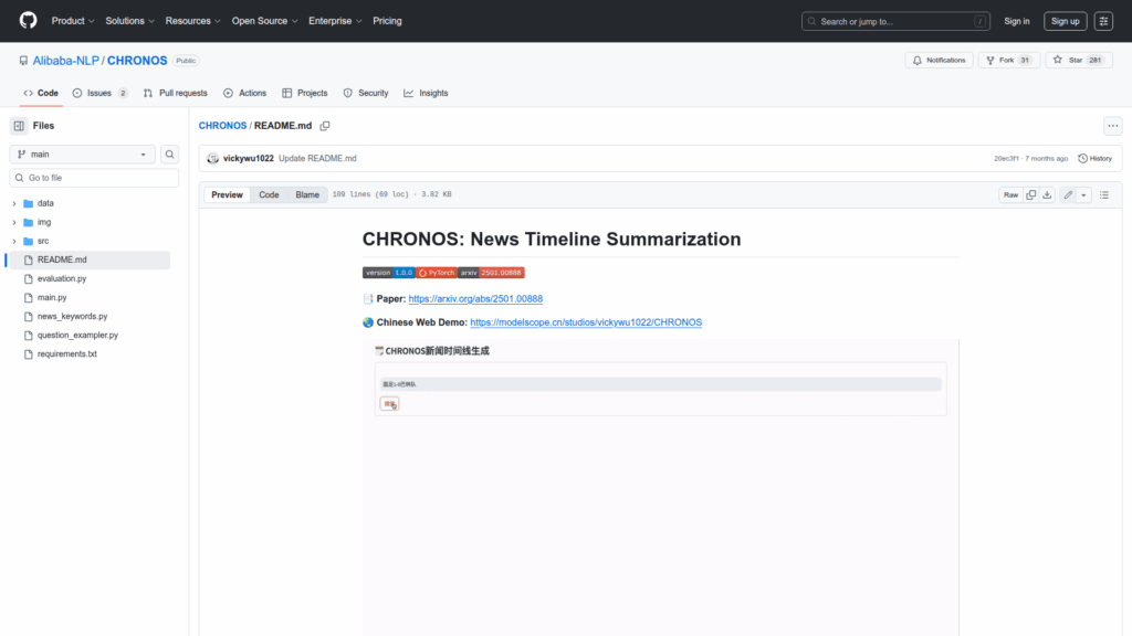 CHRONOS helps researchers and practitioners reproduce and extend an approach to open-domain timeline summarization. The released Open-TLS dataset supplies larger and longer timelines than prior public sets, enabling evaluation on up-to-date news sequences. The codebase provides a full pipeline to query the web, generate example questions, run iterative retrieval and summarization with configurable rounds, and save retrieved documents and evaluation results. Instructions show how to plug in large language models and web search keys so users can test different LLMs and search settings. The repo is useful for benchmarking, experimenting with iterative retrieval strategies, and building demo apps based on the provided example and modelscope reference.