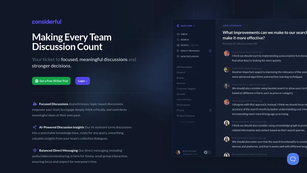Considerful is an AI-driven platform designed to enhance team communication through focused, asynchronous discussions that prioritize meaningful engagement. This tool facilitates structured conversations, allowing team members to contribute their insights and ideas at their own pace, ultimately leading to stronger decision-making. With integrated direct messaging features that support audio, video, and screensharing, Considerful ensures timely interactions while respecting everyone's time. The AI assistant transforms discussions into a searchable knowledge repository, making it easy to retrieve valuable insights from past dialogues. Users benefit from customizable notifications and a clean interface that reduces distractions, promoting productivity and collaboration. Whether onboarding new members or maintaining context across projects, Considerful streamlines team discussions, fostering a distraction-free environment for deeper conversations.