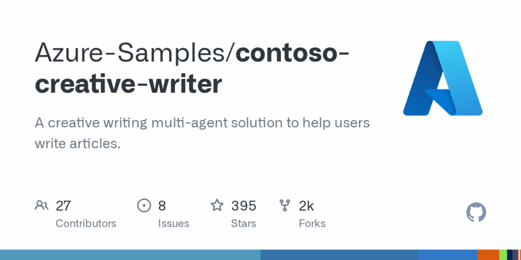 Contoso Creative Writer is a sample application and developer template that demonstrates how to build and orchestrate multi-agent AI workflows for creative writing using Azure services. The repository shows a working FastAPI backend and a web UI that accept a topic and instructions, then run a set of coordinated agents: a research agent that uses Bing Grounding, a product agent that queries an Azure AI Search vector index, a writer agent that combines findings, and an editor agent that refines the final article. The project is implemented in Python, uses Prompty to define and manage prompts, and includes orchestrator logic, prompty files for each agent, example product data loaded into a contoso-products index, tracing and evaluation utilities, and deployment scripts that use the Azure Developer CLI. The README documents setup options including GitHub Codespaces, VS Code Dev Containers, and azd-based deployment and resource provisioning requirements.