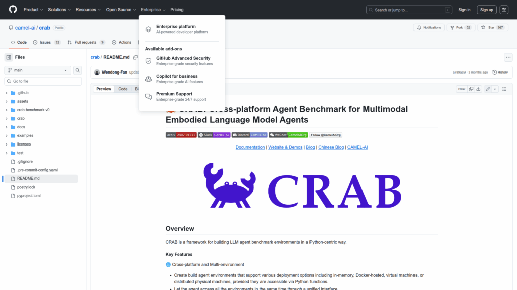 CRAB is a Python‚Äëcentric framework and benchmark suite designed to build, run, and evaluate language‚Äëmodel driven agents across multiple types of environments. It targets researchers and developers who need a reproducible way to create agent environments, define tasks, and measure agent behavior in in‚Äëmemory setups, Docker containers, virtual machines, or distributed physical machines so long as they are accessible via Python functions. The repository includes a benchmark collection (crab-benchmark-v0) with datasets and experiment code, example scripts that run template environments with OpenAI models, installation instructions, a demo video, and a reference paper on arXiv. CRAB emphasizes a unified interface to let an agent access different environments concurrently and supports multimodal embodied language model agents.