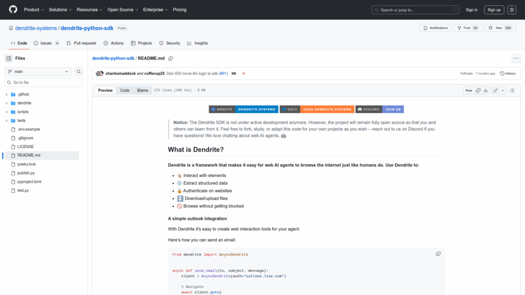 Dendrite Python SDK is a developer-focused framework for building web-capable AI agents that browse and interact with websites like humans. It provides an asynchronous client API (AsyncDendrite) to navigate pages, click and type into elements, fill fields, press keys, extract structured data, convert pages or fragments to markdown, authenticate on sites and save cookies, and download or upload files. The README includes concrete examples such as automating Outlook to send email, scraping Y Combinator company listings, extracting metrics from Google Analytics, and downloading bank transactions. The SDK supports scaling via a remote browser client that integrates with Browserbase, and it can be combined with external LLMs by configuring API keys such as Anthropic. The project is open source but not under active development; it remains available for forking, study, and adaptation.