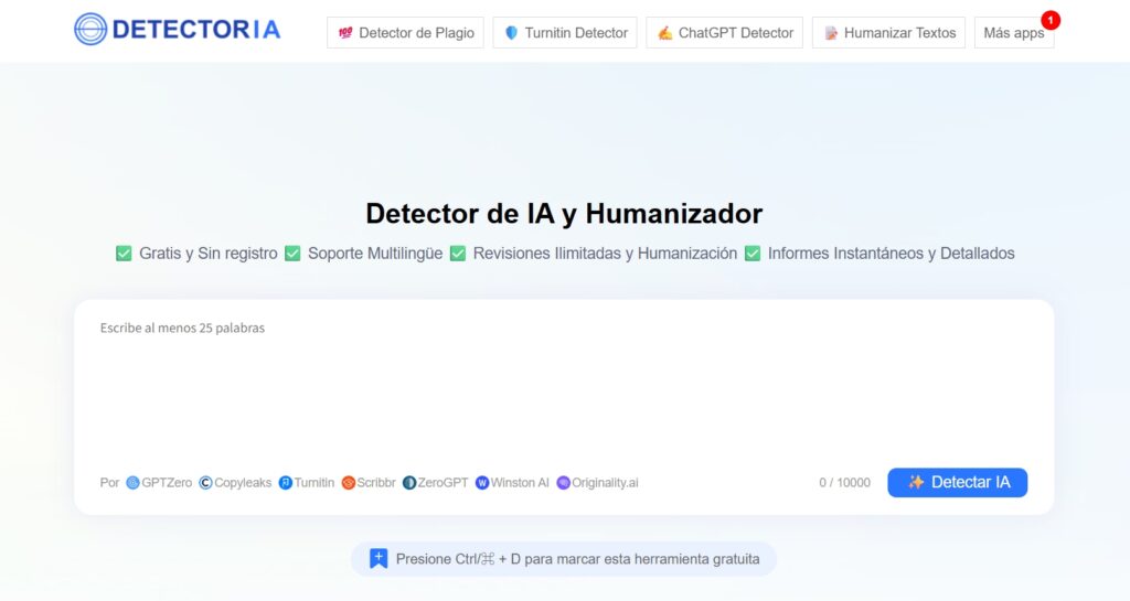 Detector de IA y Humanizador online y gratuito. Compatible con ChatGPT, GPT-5, Gemini y Claude. Gratis, sin registro, y rápido.