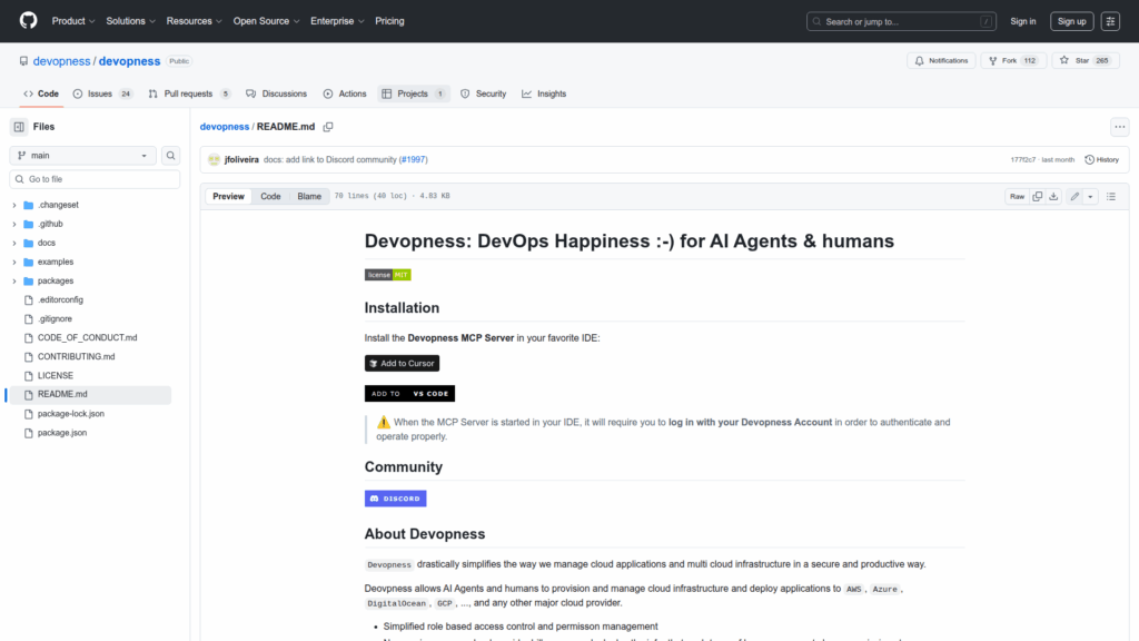 Devopness is a platform and set of packages designed to simplify provisioning, deployment and management of cloud applications and multi‚Äëcloud infrastructure for both AI agents and human teams. The repository contains the core MCP Server integration targeted for IDEs, SDKs for JavaScript and Python, a React UI component library, documentation, and release notes. Devopness focuses on enabling agents and people to deploy to major cloud providers such as AWS, Azure, GCP and DigitalOcean while enforcing permissions and auditability. The project aims to make infrastructure and CI/CD operations predictable and controllable by providing role‚Äëbased access, visibility into actions, and tooling that integrates into developer workflows and IDEs.