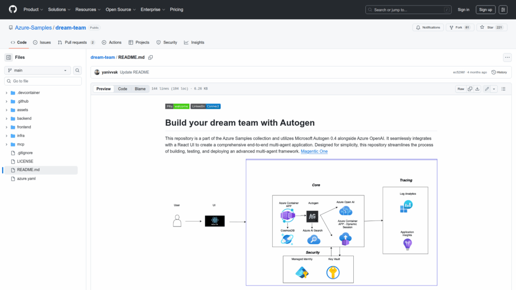 This repository is an Azure Samples project that demonstrates how to build an end-to-end multi-agent application using Microsoft Autogen (including Magentic One) together with Azure OpenAI and a React-based UI. It provides a reference architecture and working example that combines a Python backend and a JavaScript frontend to show how multiple agents can be composed, orchestrated, and deployed to Azure. The repo is intended for developers who want a complete sample for testing, running, and deploying advanced multi-agent workflows with event-driven, asynchronous Autogen components. It also surfaces deployment patterns such as one-line azd up via the Azure Developer CLI and shows how to integrate AI Search ingestion, managed identities, secure code execution via containerized sessions, and observability tooling for agent tracing.
