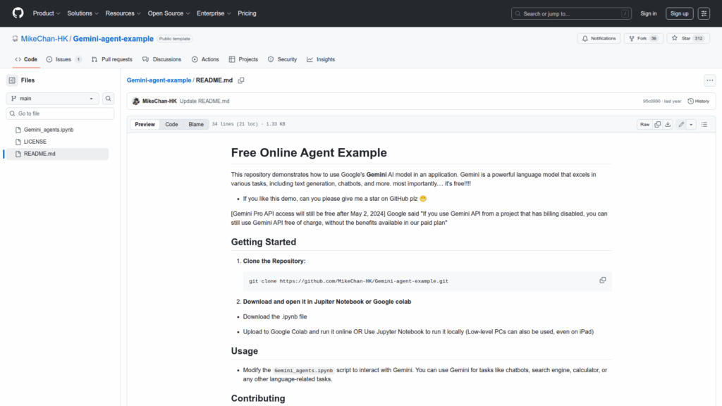 This repository is a hands-on demonstration showing how to use Google's Gemini language model inside an application. It is presented as a free online agent example and includes a ready-to-run Jupyter/Colab notebook named Gemini_agents.ipynb that users can modify. The primary aim is to let developers and experimenters build simple language-based agents and utilities without using an OpenAI API key, leveraging free access to Gemini when billing is disabled. The README highlights common example tasks such as chatbots, search engine interfaces, and calculators while noting that the project is open source and licensed under the MIT License. The repository targets people who want a quick, runnable template to experiment with Gemini on Google Colab or on local low-powered machines.