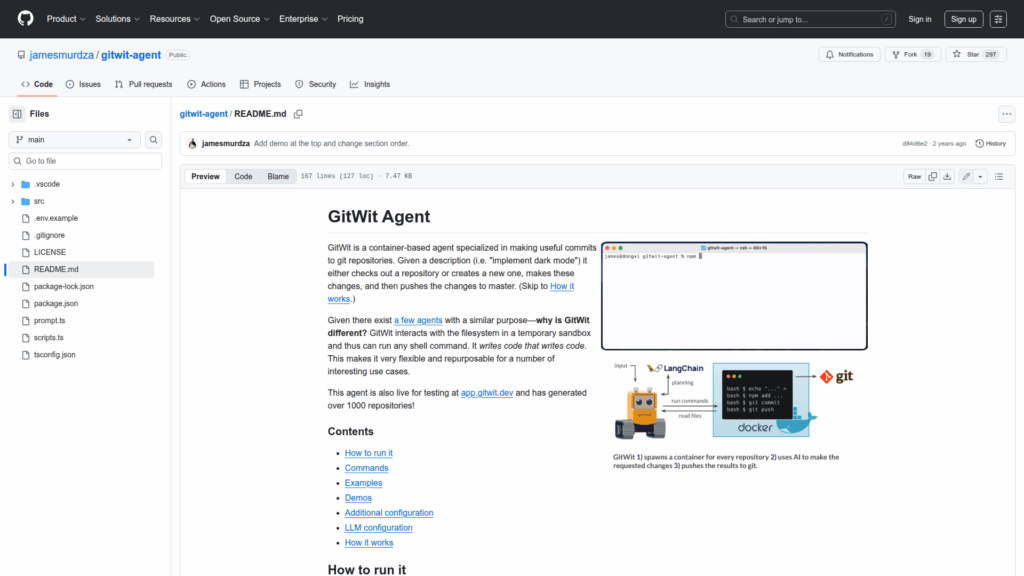 GitWit Agent is a container-based AI agent that automates making useful commits and generating entire git repositories or new branches from a natural language description. Given a prompt such as "implement dark mode" it can either create a new GitHub repository or check out an existing one, modify files inside a temporary Docker sandbox by running shell commands and scripts, and then push changes to the repository. The project is implemented in Node.js and requires Docker, a GitHub personal access token, and an OpenAI API key. The README emphasizes that the agent operates on the filesystem in a sandbox, can run arbitrary shell commands, and therefore can "write code that writes code." The agent is available for testing as a live service and has been used to generate many example repositories, demonstrating its purpose as an automated code-generation and commit tool for repository scaffolding, prototyping, and scripted edits.