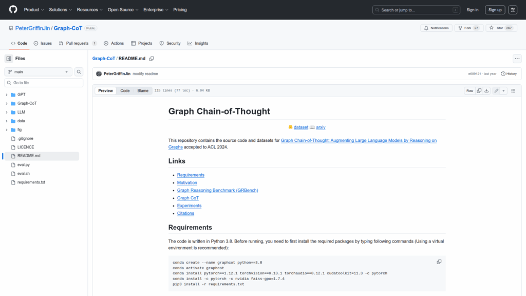 This repository contains the source code, datasets, and experimental scripts for Graph Chain-of-Thought (Graph-CoT), a method and ACL 2024 paper that augments large language models by enabling stepwise reasoning on text-attributed graphs. It provides the Graph-CoT implementation and the Graph Reasoning Benchmark (GRBench) with ten real-world graphs across academic, e-commerce, literature, healthcare, and legal domains. The repo includes instructions for environment setup and dependencies, data placement conventions for processed graphs and question-answer sets, and guidance for running Graph-CoT and related baselines. It groups model code into folders for Graph-CoT, open-source LLM baselines, and GPT variants, and is intended to support reproducible research and experimentation on augmenting LLMs with structured graph knowledge.
