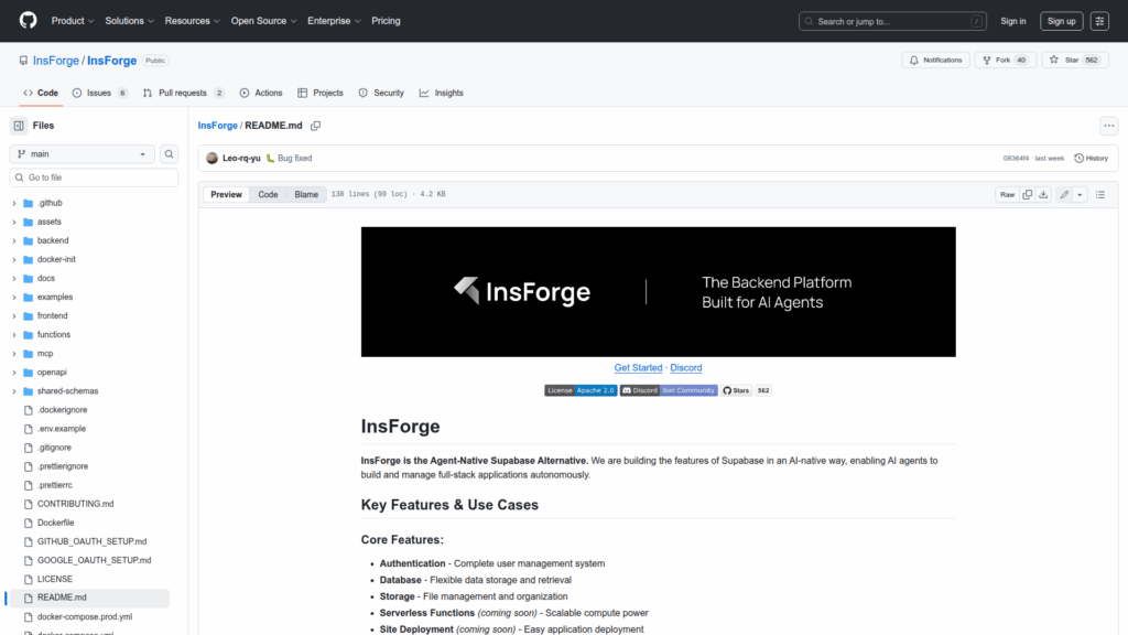 InsForge is an agent-native backend platform and a Supabase-style alternative designed to let AI agents build and manage full-stack applications autonomously. The repository provides the server and dashboard components needed to self-host a backend that agents can control, including user management, data storage, and file storage. It is targeted at developers and teams who want to connect language models such as Claude or GPT to a managed backend via an MCP (model control plane). The project includes quickstart instructions using Docker, a local dashboard for configuration and testing, prompt examples and sample project prompts to accelerate building common apps like todo lists or image-sharing platforms. Documentation is a work in progress and the project invites contributors and community support via Discord and a contribution guide.