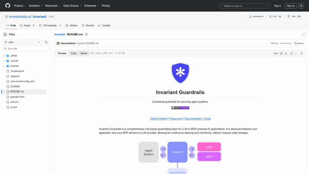 Invariant Guardrails is a rule-based guardrailing layer designed to secure LLM and multi-component platform (MCP) powered AI applications. It operates between an application and its LLM or MCP servers as a proxy that continuously steers, inspects and monitors requests and tool calls without requiring invasive changes to application code. The project provides a Python-inspired domain specific language for writing matching rules that identify and prevent unsafe or malicious agent behaviors by inspecting message traces and function/tool invocations. It can be deployed via a Gateway integration that evaluates rules on each request, or used programmatically via the invariant-ai package to run policies locally or via the Invariant Guardrails API. The repository includes example rules, detectors such as prompt injection checks, a standard library of operations, documentation and a playground for testing rules.