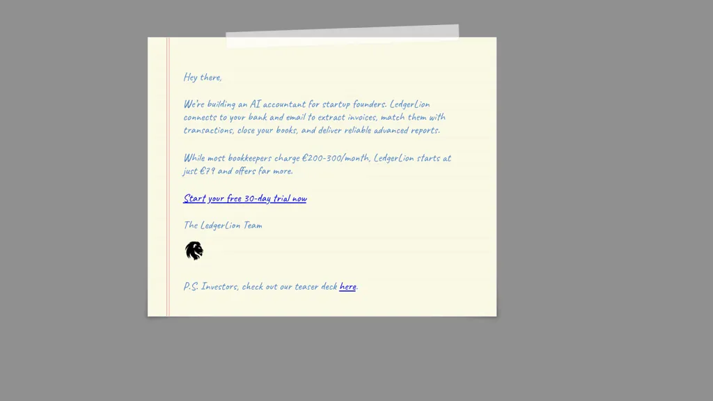 LedgerLion is an AI-based accounting tool designed specifically for startup founders and small business owners. This tool streamlines financial management by automatically connecting to bank accounts, extracting invoices, and matching transactions. LedgerLion simplifies the bookkeeping process, facilitating the closing of financial books while delivering comprehensive reports that enhance financial visibility and decision-making. With the ability to replace traditional bookkeeping services that can cost between €200-300 per month, LedgerLion offers a cost-effective solution starting from €79. Users can initiate a free 30-day trial to explore its full capabilities without commitment.