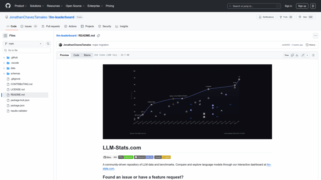 This repository is a community-maintained collection of structured data and benchmark results for large language models. It collects metadata for hundreds of LLMs including model sizes, context window limits, licensing, provider configurations and pricing, and measured performance such as throughput and latency. The project centralizes standardized benchmark scores and organizes all entries so contributors and consumers can compare models side by side. Data is stored under a clear directory layout with schemas for validation and a public contribution workflow. An interactive dashboard is provided to explore and visualize leaderboards and model comparisons. The repo is intended as a reference resource for anyone evaluating or documenting LLM capabilities and for community-driven updates to maintain accuracy.