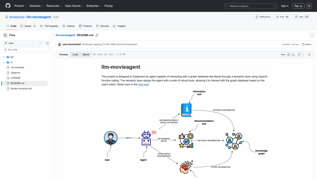 The project features a semantic layer that translates natural language into function calls and graph queries, enabling reliable interaction between an LLM and Neo4j. It exposes three primary tools: an information tool for retrieving movie and person data, a recommendation tool for personalized movie suggestions, and a memory tool that stores user preferences in the knowledge graph. The codebase is Dockerized with separate services for Neo4j, an API that leverages LangChain templates, and a Streamlit UI at localhost:8501. An ingest.py script imports a MovieLens-based dataset and creates fulltext indices in Neo4j. Configuration is managed via a simple .env file with OpenAI and Neo4j credentials.