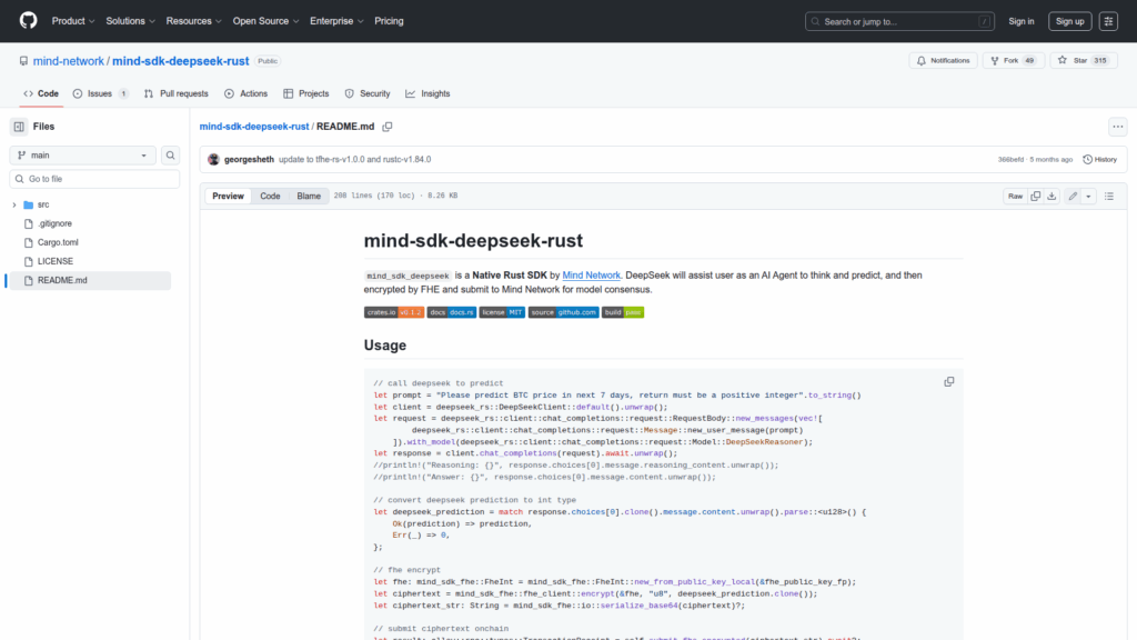 mind-sdk-deepseek-rust is a native Rust SDK from Mind Network that provides access to DeepSeek, an AI agent that performs reasoning and predictions then encrypts outputs with fully homomorphic encryption (FHE) for submission to Mind Network for model consensus. The repository supplies a Rust client API for chat-style completions (including a DeepSeekReasoner model), example usage demonstrating a predict-then-encrypt workflow (BTC price prediction example), FHE integration through the mind_sdk_fhe crate and TFHE-rs, and a command-line binary for voter node operations. The README documents required versions (TFHE-rs v1.0.0, rustc v1.84.0), installation via Cargo, build and run commands, and CLI options used to configure node files and logging. The project is published on crates.io, documented on docs.rs, and licensed under MIT.
