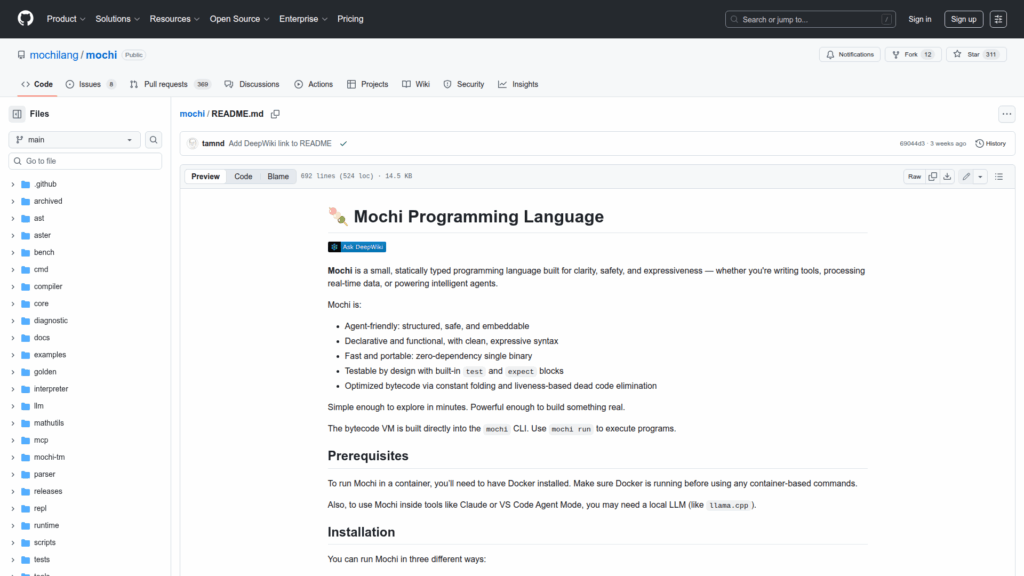 Mochi is a small, statically typed programming language and toolchain designed for developers who want a compact, embeddable language for building tools, processing real-time data, and powering intelligent agents. The repository provides the mochi CLI and built-in bytecode VM for running Mochi programs, a language server and a VS Code extension for editor integration, example programs, and support for running as an MCP server to connect with agent host environments like Claude or VS Code Agent Mode. It includes prebuilt binaries, Docker images, and instructions to build from source, so users can run, test, build, serve and extend Mochi on their platform. The README emphasizes agent-friendliness, portability as a single zero-dependency binary, and testability via built-in test and expect blocks.