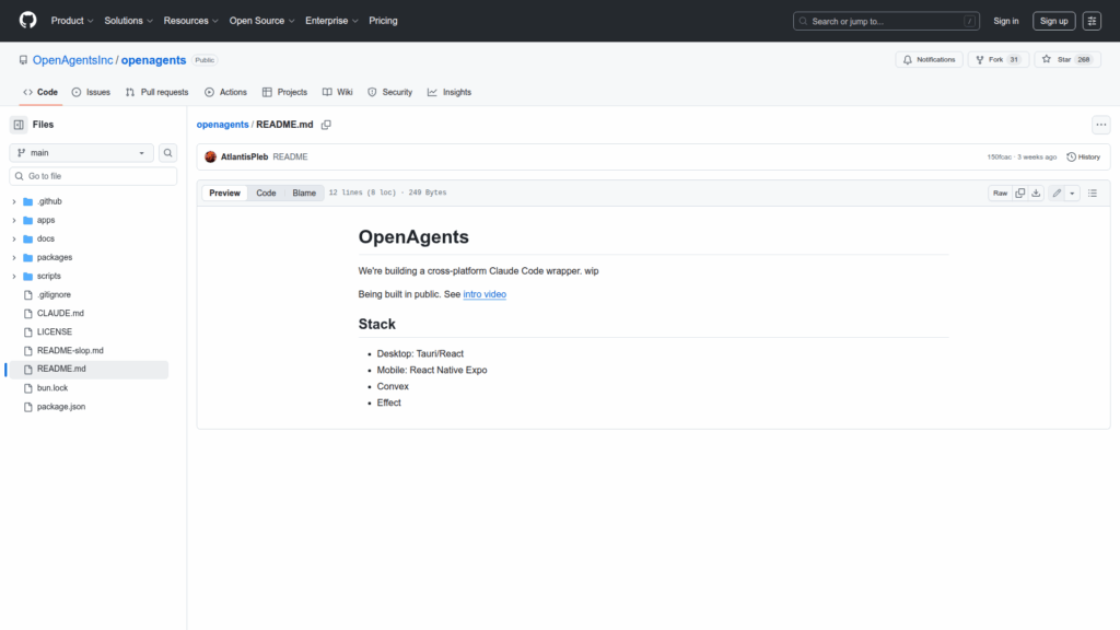 OpenAgents is a work-in-progress repository that implements a cross-platform wrapper around Claude Code and aims to serve as a platform for AI agents. The README states the project is being built in public and identifies the primary goal as providing a unified Claude Code experience across desktop and mobile environments. The repository lists a technology stack including Tauri and React for desktop, React Native Expo for mobile, and uses Convex and Effect as part of its stack. The project is explicitly described as a wrapper and platform rather than a finished product, and it is presented as an open development effort with an introductory video and ongoing public commits.