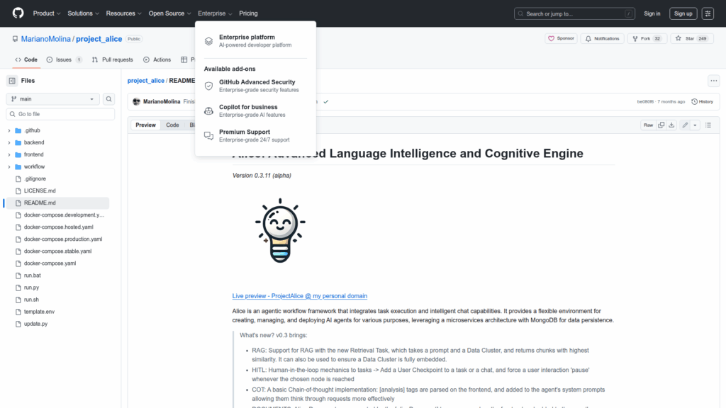 Project Alice is an open-source agentic workflow framework designed to create, manage and deploy AI agents and automated tasks. It combines conversational chat capabilities with a task execution engine in a microservices architecture that uses MongoDB for persistence. The repository contains three main components: a Node.js/Express TypeScript backend that manages the database, LM Studio interactions and file serving; a Python Workflow container built with Pydantic that implements task and chat execution logic; and a React TypeScript frontend that provides a flow viewer, task editor and chat UI. The project is model-agnostic and supports local and remote models, local LM Studio deployments and many API providers. It targets developers and teams who want a flexible environment to prototype agent workflows, run retrieval-augmented workflows, and deploy agents programmatically via exposed workflow endpoints.