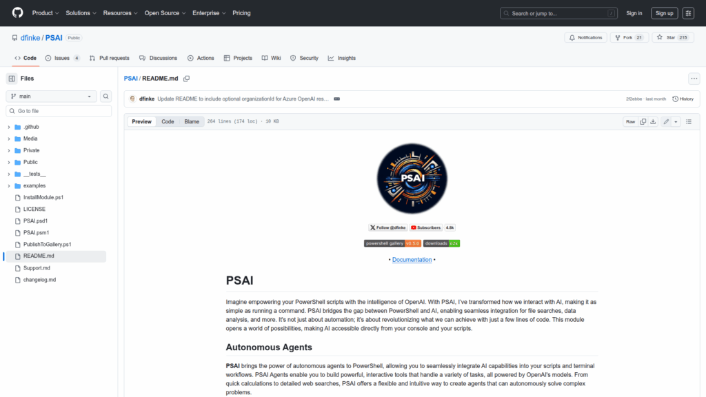 PSAI is a PowerShell module that integrates OpenAI and Azure OpenAI capabilities into the PowerShell console and scripts. It is designed to let users create and run autonomous agents from the command line, combine AI models with PowerShell functions, and extend scripts with natural language-driven behaviors. The module supports basic chat and conversation commands, agent creation, and provider configuration for both OpenAI API keys and Azure OpenAI secrets. PSAI is intended to bridge automation and AI by enabling file searches, data analysis, web queries, calculations, and other tasks directly from PowerShell. It also includes utilities to package GitHub repositories into AI-optimized prompts for use with ChatGPT, Claude, or Gemini. The project is distributed as an installable PowerShell module and includes examples and documented commands to get started.