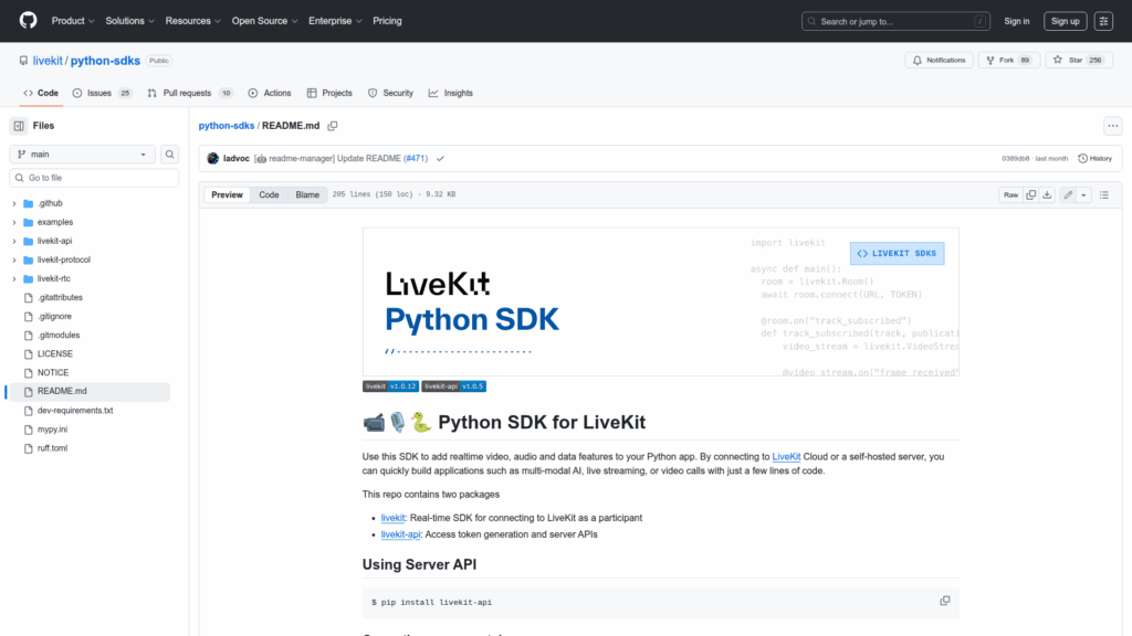 Helps Python developers integrate realtime communications quickly by providing ready-made client and server libraries with clear examples. The server API simplifies token creation and room lifecycle management so backends can provision rooms and grants programmatically. The realtime SDK offers event hooks for participant and track events and an async programming model suitable for scalable applications. VideoStream and track subscriptions let developers process frames or forward media to other services. RPC support enables custom method calls between participants, useful for agent integrations or forwarding LLM function calls. Example scripts accelerate prototyping for common flows such as face landmark detection and synthetic track publishing, and the README links to community channels for support and contribution.