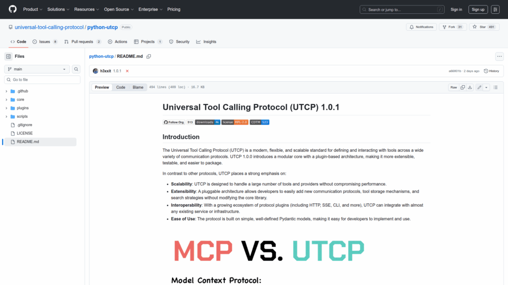 python-utcp is the official Python implementation of the Universal Tool Calling Protocol (UTCP). It implements a standard and client library for describing, discovering, registering, searching for, and invoking tools provided by remote services or local resources. The repo provides Pydantic data models for UTCP manuals and tools, an asynchronous UtcpClient that loads provider definitions from a providers.json file, transport interfaces for multiple communication protocols, and example servers and clients. It includes runnable examples for full LLM integration, a FastAPI manual/discovery server example, and guidance for wrapping existing APIs and CLIs as UTCP tools. The project emphasizes scalability, interoperability with many provider types, and ease of use for developers building or consuming tool-based services.
