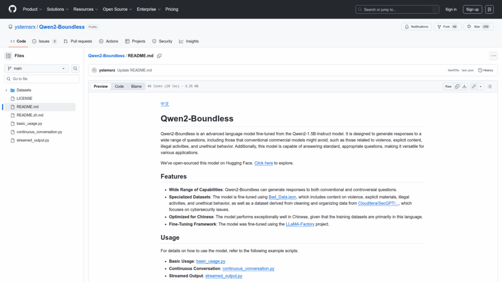 This repository hosts Qwen2-Boundless, an open source language model that was fine-tuned from the Qwen2-1.5B-Instruct base to generate responses across a wide range of questions, including topics that many commercial models avoid. It is primarily optimized for Chinese and intended as a research-oriented model that can produce standard, controversial, or sensitive content for controlled experimentation and evaluation. The project includes example scripts for basic usage, continuous conversation, and streamed output to demonstrate inference patterns. The README documents the fine-tuning datasets and framework used and points to the model release on Hugging Face. The maintainers emphasize research use and advise operating the model in controlled environments with attention to legal and ethical responsibilities.