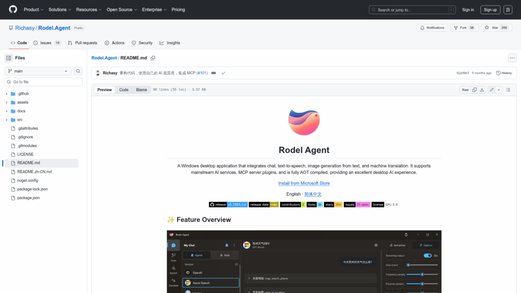 Rodel Agent is a Windows desktop application that provides an integrated AI experience combining chat, text-to-speech, image generation from text, and machine translation. It is built to support mainstream online AI services and MCP server plugins and is distributed as a fully AOT compiled desktop app for responsive local use. The repository contains the desktop UI project under src/Desktop/RodelAgent.UI and attempts to provide derivative command line tools such as Rodel.Commit under src/CLI/RodelCommit. The project targets developers who want to build or contribute to a desktop AI assistant and end users who want a single Windows app that aggregates multiple AI capabilities. Development requires Visual Studio 2022 and runtime dependencies including .NET 9 and Windows App SDK 1.7. The README references a documentation website and release artifacts for more detailed introduction and installation via the Microsoft Store.