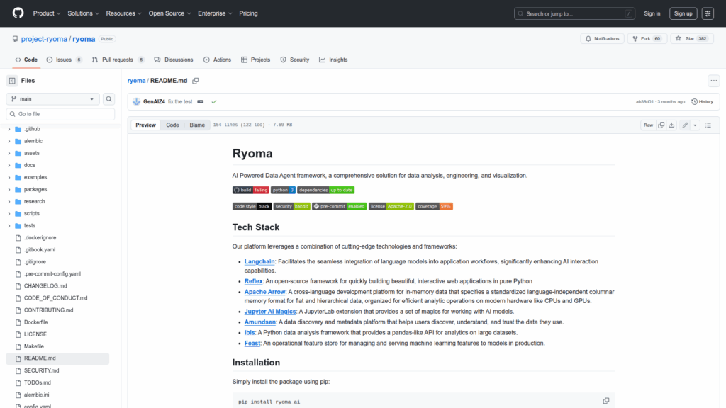 Ryoma is an AI-powered data agent framework designed to help teams analyze, engineer, and visualize data by combining language models with data tooling. The project provides prebuilt agents such as a SqlAgent that can connect to data sources, generate and run SQL, and stream results. It integrates with a broad tech stack including LangChain for LLM workflows, Reflex for a web UI called Ryoma Lab, Apache Arrow for in-memory data, Ibis for analytics, Feast for feature management, and Amundsen for metadata. The README shows how to install the package via pip and how to start an interactive lab application. Ryoma also documents supported model providers and supported data sources and engines, positioning itself as a framework for building AI-driven data workflows and interactive data assistants.